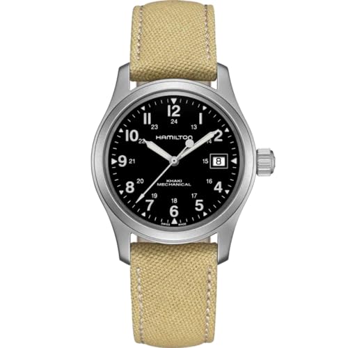 Hamilton Reloj Khaki Field mecánico, fabricado en Suiza, caja de acero inoxidable de 38 mm, esfera negra, correa de lona beige (modelo: H69439933), Negro -, Casual