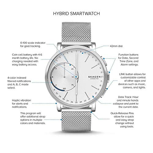 Smartwatch híbrido unisex SKAGEN CONNECTED – Caja redonda de acero inoxidable (diám. 42 mm) con acabado pulido brillante – 3 pulsadores cromados – 3 ATM de resistencia a la presión del agua
