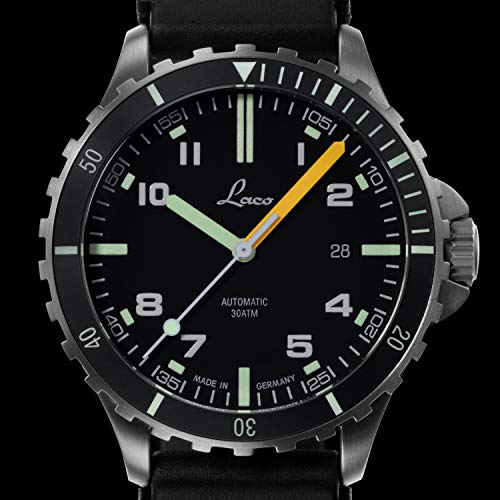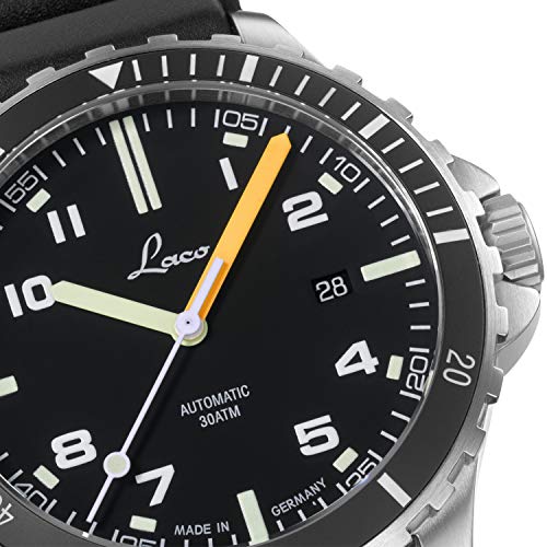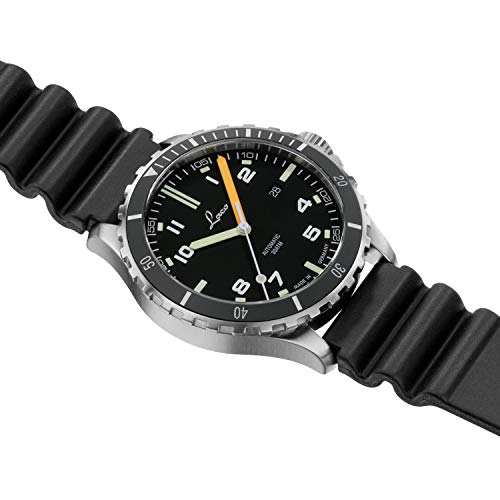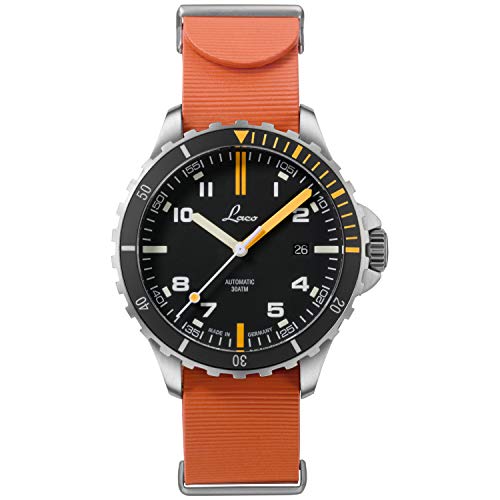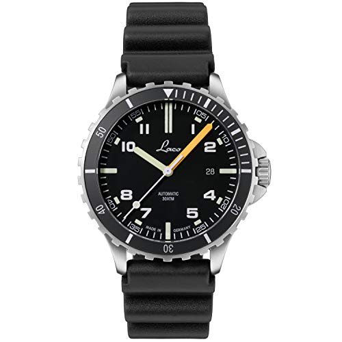 En muchas ocasiones únicas – la carcasa de acero inoxidable con doble cristal de zafiro antirreflectante y la base de tornillo de acero inoxidable con relieve de un escorpión se presentan como verdaderas características de diseño. En la esfera negra mate, los números y índices arábigos están ocupados con la masa luminosa Superluminova y destacan especialmente (con minutería blanca). Una correa de caucho negra con cierre de acero inoxidable completa el aspecto general de este Laco de forma elegante.
