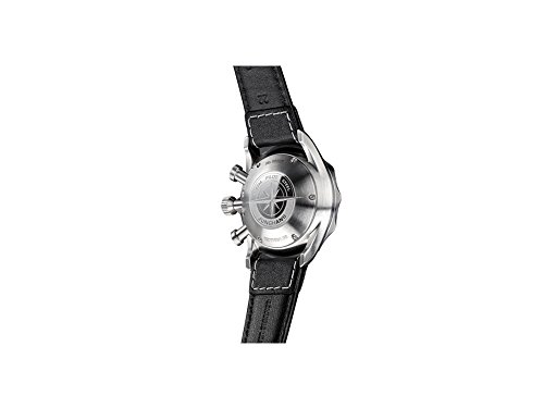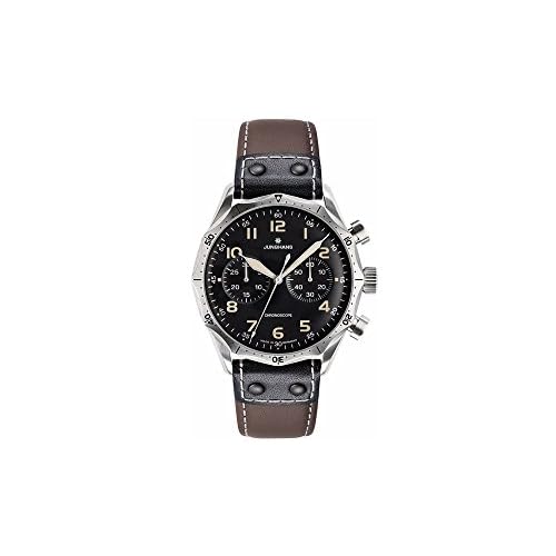 Carcasa de acero inoxidable, 7 capas con base de la caja, bisel giratorio con escala de minuto por ambos lados, curvo y ambos lados de cristal antireflectante, resistente al agua hasta 10 bar, Ancho (sin corona) 43 mm, altura 14,4 mm, correa de piel negro, mecanismo automático de precisión calibre j880.4, función de cronómetro, esfera negra, números y manecillas plateadas – con bombilla bombilla, masa descentralizada segundero