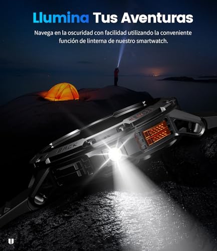⌚【Military Smartwatch with LED Torch】Equipado con cristal de dureza 9H. Sometido a mecanizado multietapa para un efecto pulido y diseño de metal satinado, ofrece una sensación de alta calidad y durabilidad garantizada. El botón lateral mecánico de diseño exclusivo no sólo conserva la elegancia tradicional de los relojes mecánicos, sino que también añade una potente función de linterna con un LED de alto brillo que ilumina hasta 20 metros de distancia.