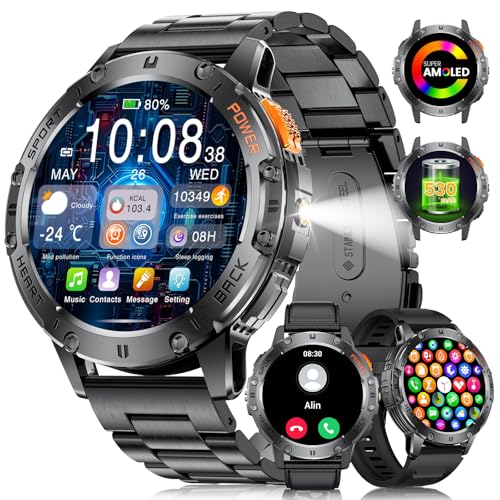 LIGE Reloj Inteligente Hombre con LED Linterna,3 Cinturini,530 mAh,1.43″ AMOLED Smartwatch para Android iOS,5ATM Impermeable,Llamadas Bluetooth,24H Frecuencia Cardíaca,300+ Watch Faces Smart Watch