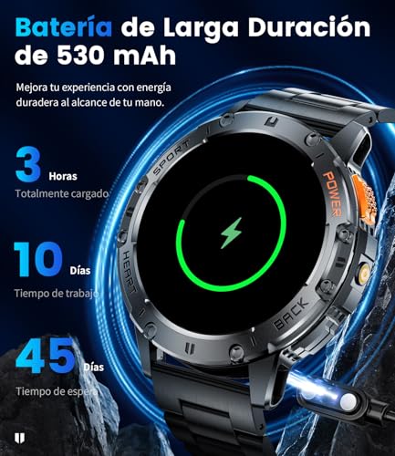 🔋【Rendimiento de batería inigualable】Nuestro reloj inteligente compatible con iOS y Android cuenta con una robusta batería de 530mAh, ofreciendo de 10 a 20 días de uso regular y más de 30 días en modo de espera. Impulsado por la arquitectura híbrida de Qualcomm y el procesador super chip de Realtek, garantiza un rendimiento duradero y eficiencia energética. El mejor rendimiento y la fuerte duración de la batería del reloj satisfacen completamente tus necesidades de batería para viajes de negocios o actividades al aire libre.