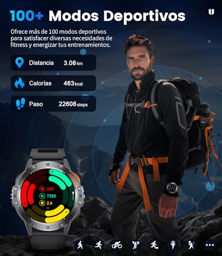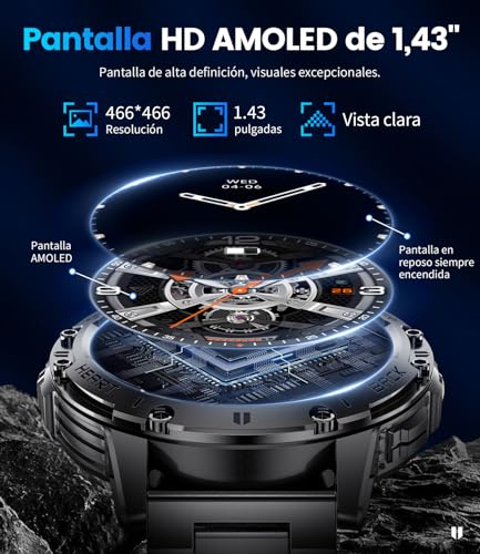 🌈【Pantalla AMOLED recientemente mejorada】①Visibilidad al aire libre: Este reloj inteligente deportivo para exteriores está equipado con una pantalla táctil AMOLED circular de 1.43», con visibilidad vívida y colorida incluso a plena luz del sol.②Pantalla siempre encendida (AOD Clock): Ya no necesitas levantar la muñeca o tocar la pantalla para ver la hora, la pantalla nunca se apaga.③Eficiencia energética: Es más eficiente y clara que las pantallas LCD tradicionales, proporcionando una experiencia de usuario más fluida.