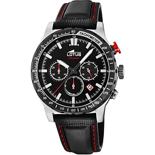 Reloj Lotus para caballero de la nueva colección Lotus R 18587/4, con caja de acero, cronógrafo, taquímetro, detalles en rojo y correa de piel negra.