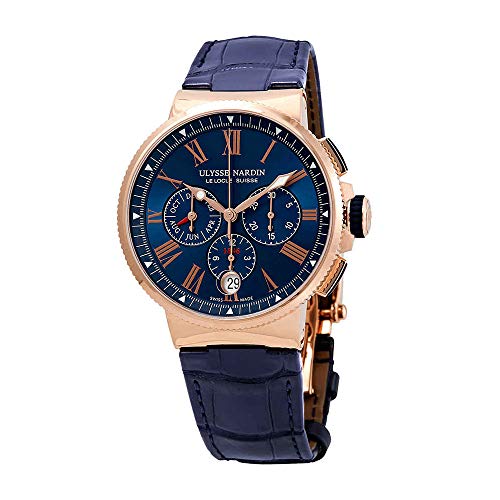 Caja de oro rosa de 18 quilates con una correa de piel azul (aligador). Bisel fijo de oro rosa de 18 quilates. Esfera azul con manecillas de tono oro rosa luminoso y marcadores de hora números romanos. Marcadores de minuto alrededor del borde exterior. Tipo de esfera: analógica. Manecillas luminosas. Indicador de fecha en la posición de las 6 en punto. Cronógrafo – Tres subesferas que mostran: 60 segundos, 30 minutos y 12 horas. Ulysse Nardin calibre UN-153 movimiento automático con una reserva de energía de 52 horas. Cristal de zafiro resistente a arañazos. Corona atornillable. Carcasa trasera transparente. Forma de la caja: redonda. Tamaño de la caja: 43mm Espesor de la caja: 15.20mm Ancho de la banda: 22mm Cierre plegable con botón de liberación. Sumergible hasta 100 metros. Funciones: cronógrafo, mes, fecha, hora, minuto, segundo, calendario anual. Estilo de reloj de lujo. Etiqueta del reloj: fabricado en Suiza. Ulysse Nardin Marine Cronógrafo Automático Reloj para Hombre 1532-150/43