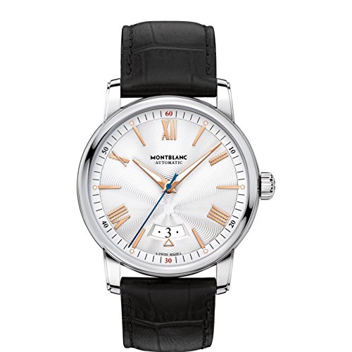 As an elegant tribute to the height of fast and luxurious travels across the Atlantic Ocean in the early 20th century, this timepiece of the Montblanc 4810 collection expresses a pure and sophisticated character. Exhibiting the classic simplicity of a three-hand watch, the central time indication is only supplemented by an arched window at 6 o clock, where a white triangle with a red gold-colored frame displays the current date. From above the date window, the Montblanc emblem radiates in a star-shaped pattern across the entire dial in a skillfully worked guilloche engraving. With its silvery-white dial featuring red gold-plated hands and indexes, the timepiece exudes a clear-cut and strong presence on the wrist. Optimal readability in the dark is ensured by the Super-LumiNova coating on the red gold-plated regate hour and minute hands as well as the odd hour indexes along the precise minuterie. The black alligator-skin wristband provides an elegant contrast with the polished and satin-finished 42 mm stainless steel case.