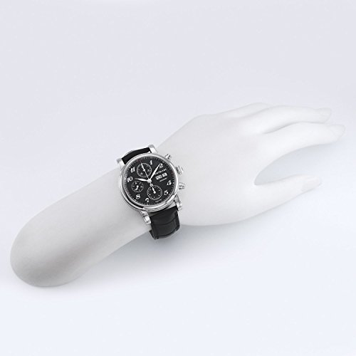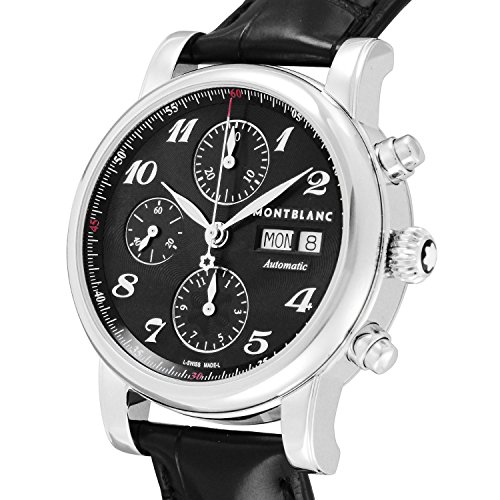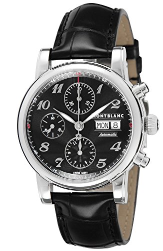 Caja de acero inoxidable con una correa de piel de cocodrilo de color negro. Bisel fijo de acero inoxidable. Esfera negra con manecillas plateadas y árabe numeral hora Marcadores. Indicadores de minuto en el borde. Tipo de esfera: Analógica. LUMINISCENTE manos y Marcadores. Día de El semana y fecha pantalla aparece en el 3 En punto Posición. Función cronógrafo: tres subdiales de 60 segundo, 30 minuto y 12 hora. Movimiento automático. Resistente a los arañazos de cristal de zafiro. Esqueleto Diseño. Diámetro de la caja: 39 mm. Estuche redondo forma. Cierre desplegable con botón. Resistente al agua a 30 metros/100 pies. Funciones: Cronógrafo, día, fecha, hora, minuto, segundo. Vestido reloj estilo. Reloj Label: Suiza Hecho. Montblanc star automático cronógrafo negro Guilloche Dial reloj para hombre 106467.