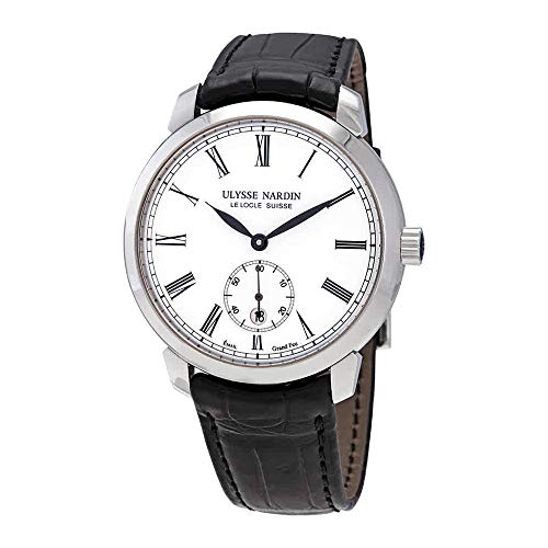 Caja de acero inoxidable con una correa de cuero negro (aligador). Bisel fijo de acero inoxidable. Esfera de color blanco esmaltado con manecillas negras y marcadores de hora números romanos. Marcadores de minuto alrededor del borde exterior. Indicador de fecha en la posición de las 6 en punto. Segundos subesfera por encima de la posición de las 6 en punto. Caliber UN-320 movimiento de auto-bobinado. Cristal de zafiro resistente a arañazos. Corona de tirar / empujar Carcasa trasera transparente. Forma de la caja: redonda. Tamaño de la caja: 40mm Ancho de la banda: 20mm Cierre de mosquetón. Sumergible hasta 30 metros. Estilo de reloj de lujo. Ulysse Nardin Nardin Classico – Reloj de pulsera para hombre, esfera blanca 3203-136-2/E0-42
