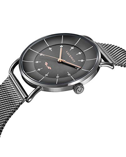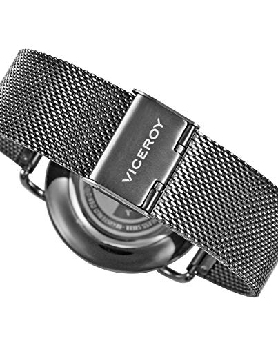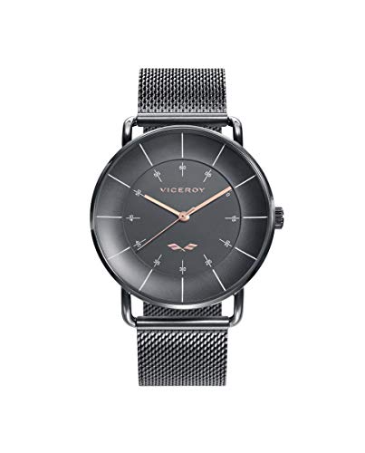 Reloj para Hombre de la Marca Viceroy, dial redondo gris oscuro con detalles rosados, Caja de Acero Inoxidable gris Ip, Correa de acero inoxidable ip gris tipo malla milanesa. Ajustable a la muñeca. Presentado en estuche Antonio Banderas.